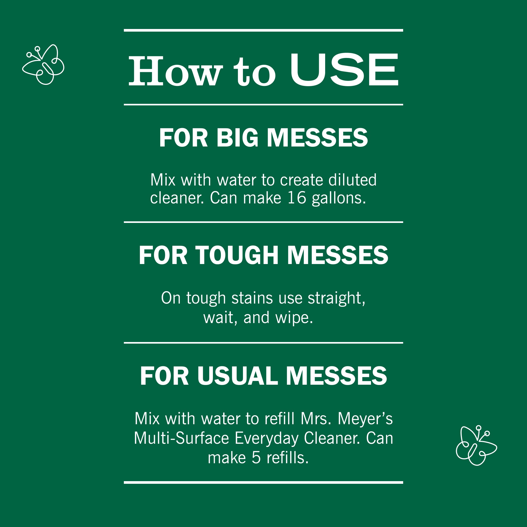 - FOR MESSES BIG & SMALL: Big messes: Dilute with water to create a powerful cleaner??makes up to 16 gallons. Tough messes: Use full strength. let sit. then wipe away. Daily messes: Mix with water to refill Mrs. Meyer’s Multi-Surface Everyday Cleaner??enough for 5 refills.