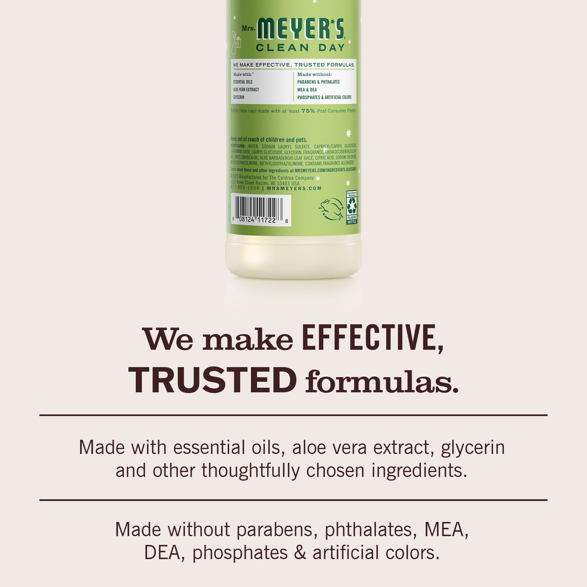 - TESTED & TRUSTED: Mrs. Meyer’s products are made with essential oils. aloe vera. glycerin. and other thoughtfully chosen ingredients that are cruelty-free and Leaping Bunny Certified.